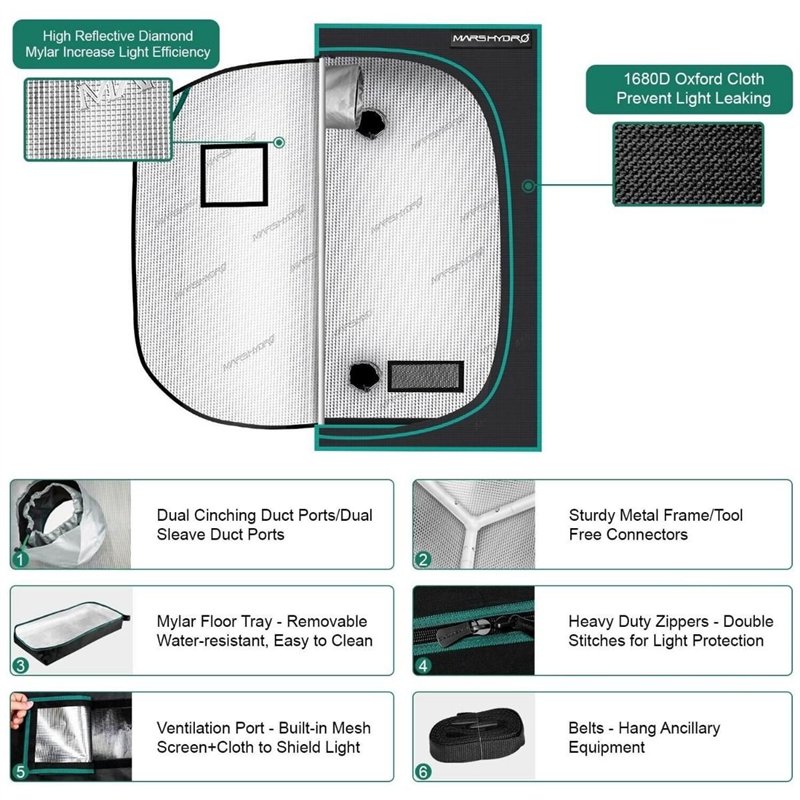 Kvalitný stan s rozmermi 70 x 70 x 160 cm. Materiál je úplne nepriesvitný a netoxický. Vnútorná plocha je reflexívna a odráža farebný svit svietidiel na rastliny. Stan má odolný zips a pevnú konštrukciu, ktorú zaisťujú odľahčené hliníkové tyče s robustnými kovovými spojmi.