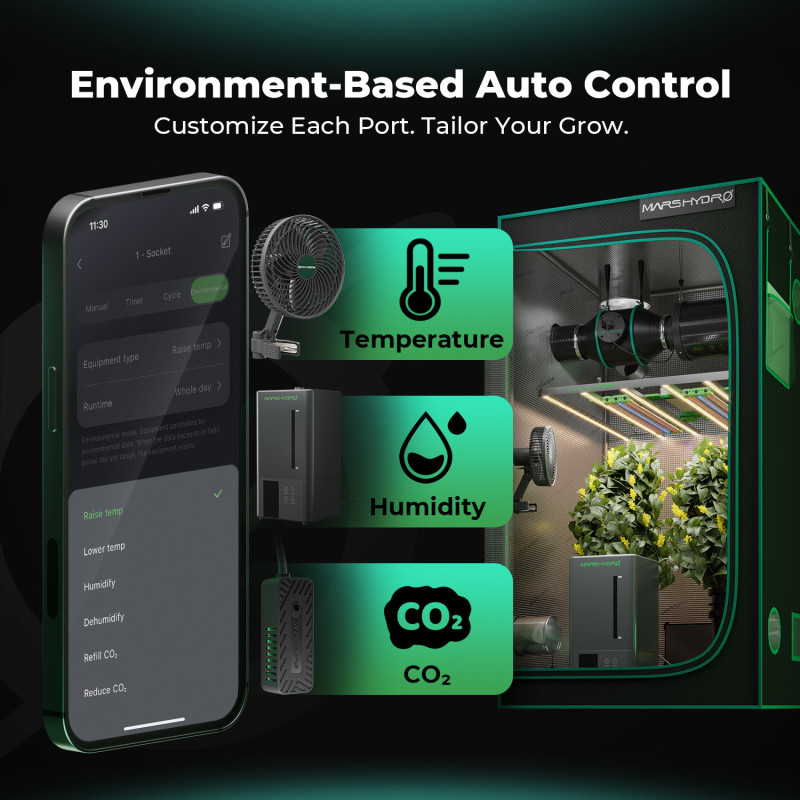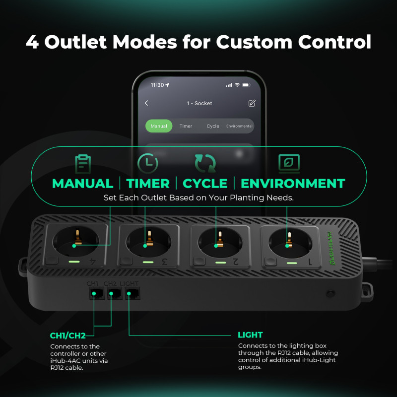Inteligentná zásuvka so štyrmi výstupmi, navrhnutá ako rozširujúci modul k ovládaču Mars Hydro iControl. Umožňuje ovládať zariadenia v režimoch Manual, Timer, Cycle a Environment a automaticky reagovať na teplotu, vlhkosť či CO₂ podľa senzorových dát. Podporuje inteligentné riadenie svetiel ADlite a možno ju prepojiť až so 40 ďalšími jednotkami na vytváranie viacerých zón aj veľkých pestovateľských priestorov. iHub-4AC výrazne rozširuje možnosti iControl systému a poskytuje flexibilné a plne automatizované riadenie pripojených zariadení.