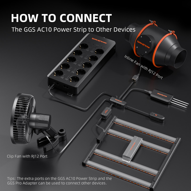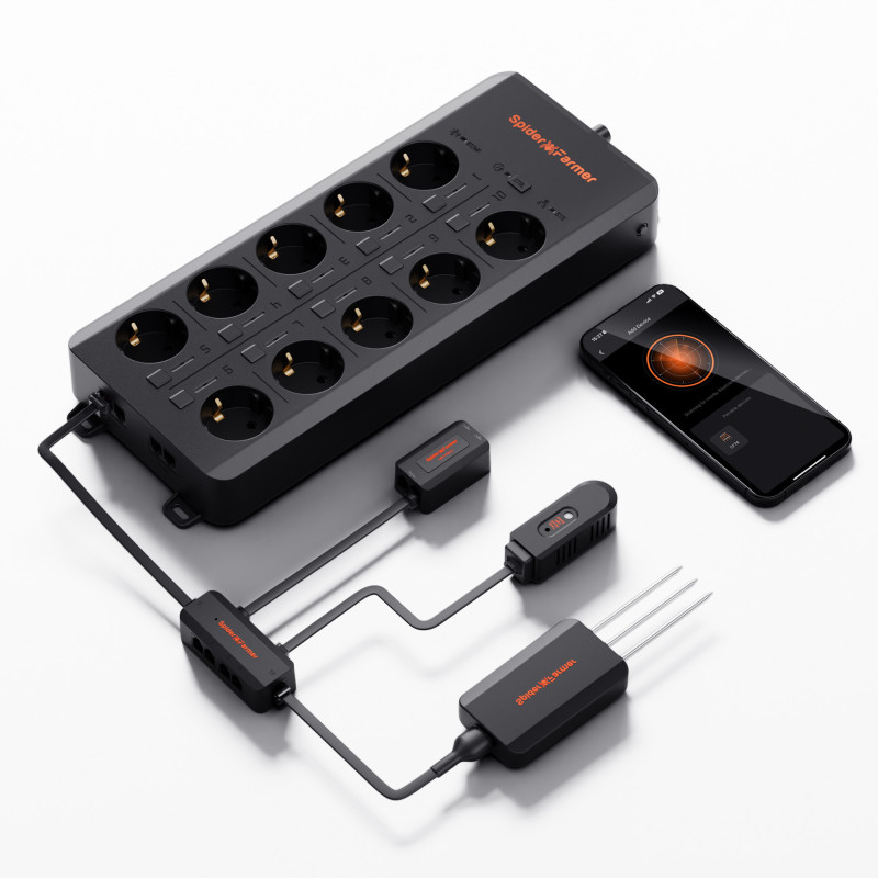 Spider Farmer GGS AC10 je inteligentná napájacia lišta s 10 nezávislými zásuvkami, ktorá umožňuje plne automatizovať celý pestovateľský priestor. Vďaka prepojeniu s aplikáciou Spider Farmer môžete na diaľku ovládať LED svetlá, ventilátory, kúrenie, zvlhčovače aj ďalšie zariadenia. Súčasťou balenia sú tiež dva senzory – pôdny a teplotno-vlhkostný so svetelným čidlom – ktoré umožňujú riadiť prostredie podľa teploty, vlhkosti, denného/nočného cyklu či stavu pôdy. AC10 podporuje časové plánovanie, cykly, režimy podľa teploty, vlhkosti a CO₂ a ponúka tak pokročilú automatizáciu pre profesionálnych aj hobby pestovateľov.