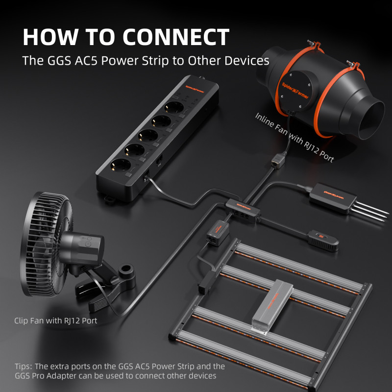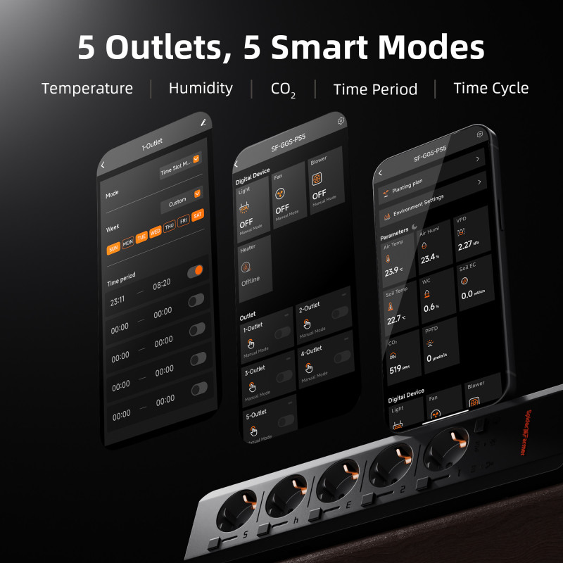 Inteligentná zásuvka s 5 nezávislými výstupmi je navrhnutá pre plne automatizované riadenie pestovacieho priestoru. Umožňuje pripojiť a ovládať LED pestovacie svetlá, ventilátory, kúrenie, zvlhčovače, odvlhčovače aj doplnkové príslušenstvo prostredníctvom aplikácie Spider Farmer. Vďaka priloženým senzorom monitoruje teplotu, vlhkosť, svetelný cyklus a stav pôdy, čo umožňuje spúšťať zariadenia podľa časového plánu, teploty, vlhkosti alebo CO₂ hodnôt. AC5 je ideálnym centrálnym riešením pre pestovateľov, ktorí chcú plnú kontrolu nad prostredím a automatizáciou bez neustáleho dohľadu.
