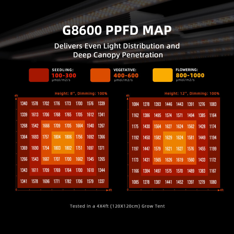 Spider Farmer G8600 je výkonné LED pestovateľské svetlo. Rad G od Spider Farmer je ideálnou voľbou pre pestovateľov, má nízku spotrebu energie, minimálne tepelné straty a životnosť až 80 000 hodín. Ideálna voľba pre efektívne indoor pestovanie za rozumnú cenu.