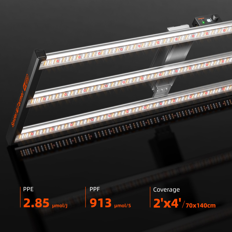 SE4500 LED pestovateľské svetlo od značky Spider Farmer je výkonné a energeticky úsporné riešenie pre vnútorné pestovanie rastlín. Vďaka špičkovým diódam Samsung LM301H EVO dosahuje vysokú účinnosť 2,85 μmol/J a fotosyntetický tok 913 μmol/s, čo zaisťuje silný a rovnomerný svetelný výkon naprieč celou plochou. Svetlo má pevnú konštrukciu s tromi LED panelmi, ktoré nie je potrebné zložito zostavovať. Inštalácia je rýchla a jednoduchá vďaka plug & play systému. Integrovaný digitálny stmievač umožňuje presné nastavenie intenzity svetla podľa aktuálnych potrieb rastlín.