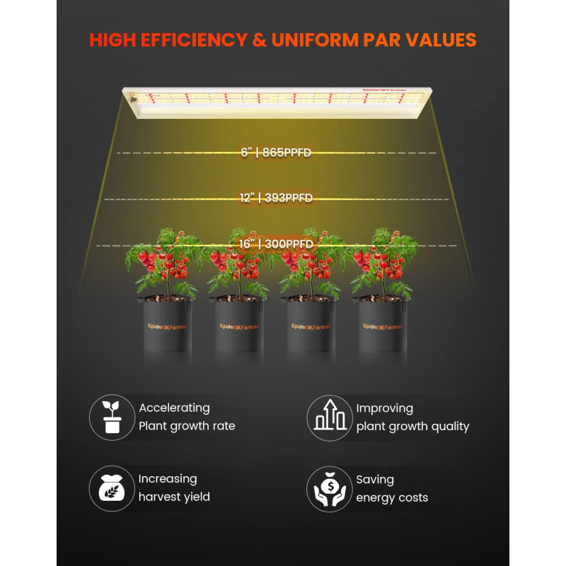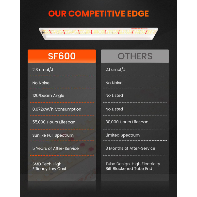 Najnovšia verzia LED svetla Spider Farmer SF600 využíva diódy OSRAM s 384 LED a výstupom 5000 lúmenov. Spotreba energie je iba 72 wattov, čo znamená nižšiu spotrebu energie a nižší účet za elektrinu v porovnaní s fluorescenčnými žiarovkami T5. Reflektory zaisťujú lepšie zameranie svetla, zvyšujú účinnosť osvetlenia, svetelný tok a koncentráciu svetla.