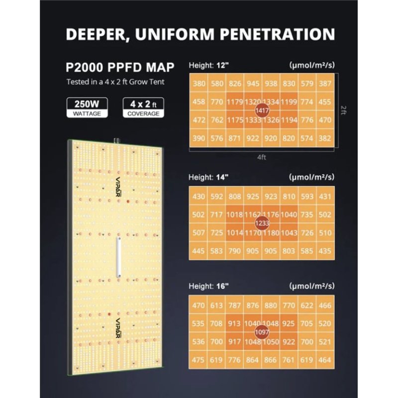 Predstavujeme vám svetlo Viparspectra PRO 2000/220W, LED panely sú v štýle QB s vysokým výkonom, tento rad zlepšuje výnos rastlín a má vysoké PPE. Využíva LED čipy Samsung SMD LM301B. Tento model umožňuje prepojenie až 20 svietidiel pomocou funkcie Daisy Chain. Produkt má spotrebu 250W a životnosť až 100 000 hodín. Ďalej má produkt vstavaný stmievač. Prevádzka produktu je úplne tichá. Produkt je pasívne chladený väčším povrchovým chladičom z kvalitného hliníka.