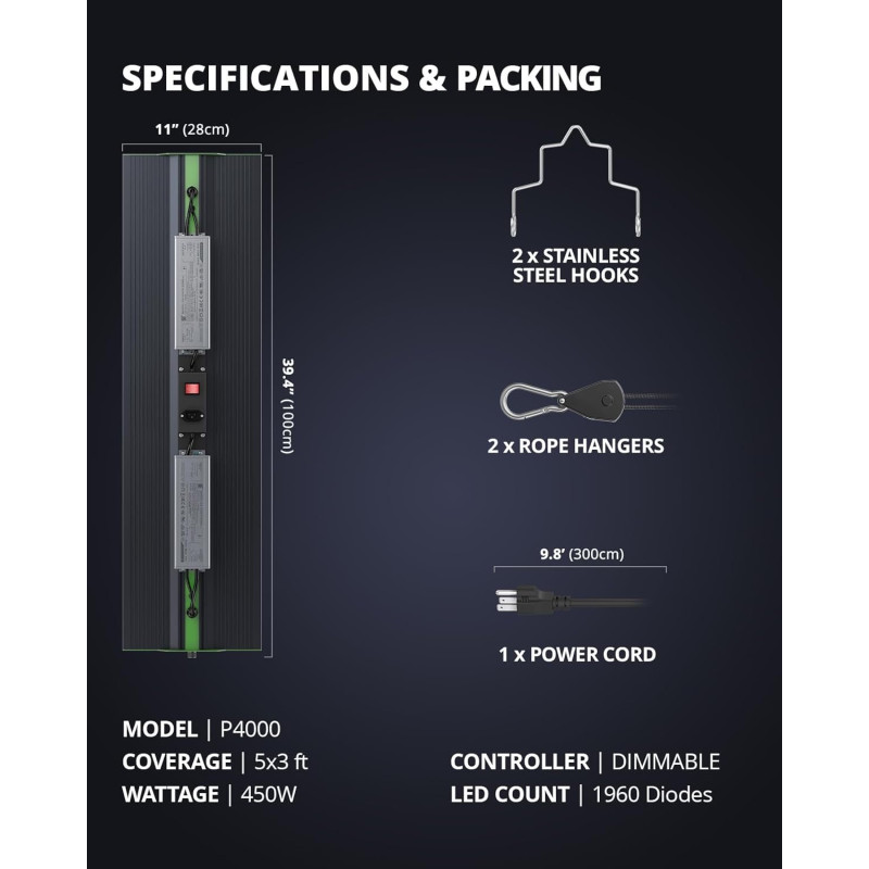 Predstavujeme vám svetlo Viparspectra PRO 4000/450W, LED panely sú v štýle QB s vysokým výkonom, tento rad zlepšuje výnos rastlín a má vysoké PPE. Produkt má spotrebu 450W a životnosť až 100 000 hodín. Ďalej má produkt vstavaný stmievač. Prevádzka produktu je úplne tichá. Produkt je pasívne chladený väčším povrchovým chladičom z kvalitného hliníka.